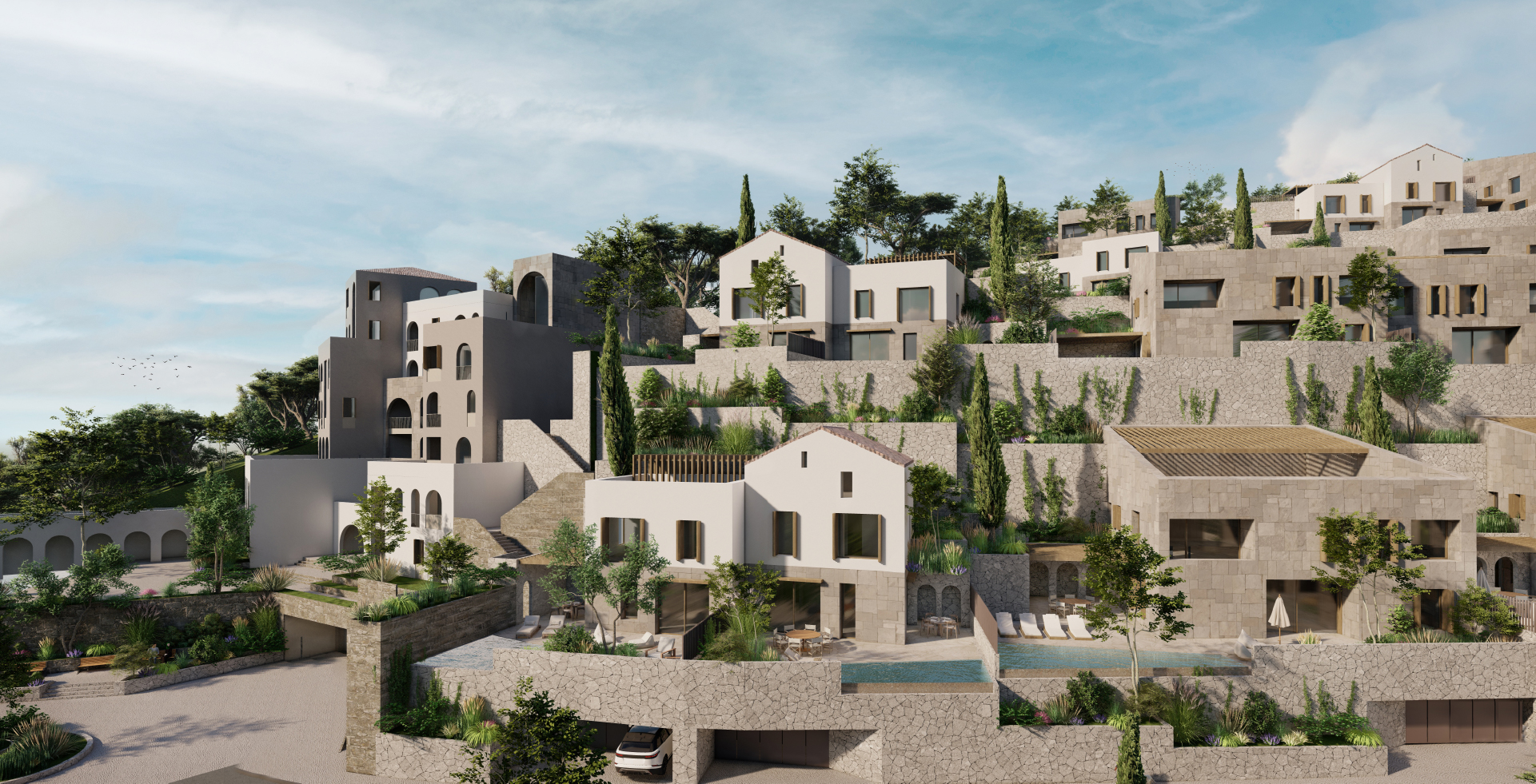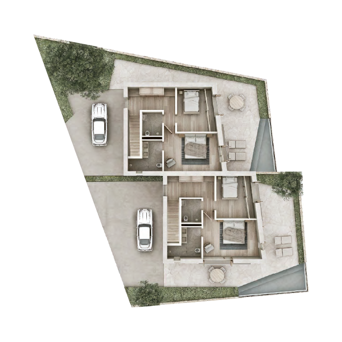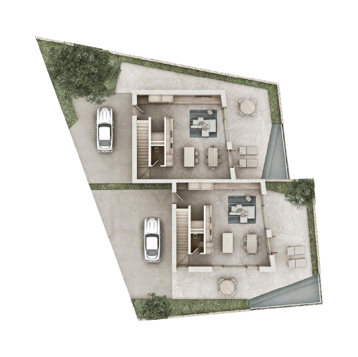 These villas are the perfect place to unwind— a unique and authentic choice for modern families. The garden and parking area are exclusive features of each villa. Folie Village promotes beauty, sustainability and offers a better way of life for all. Private villas are predominantly paired together to maximize density and strengthen the communal nature of the residential development encouraging neighbouring relationships.